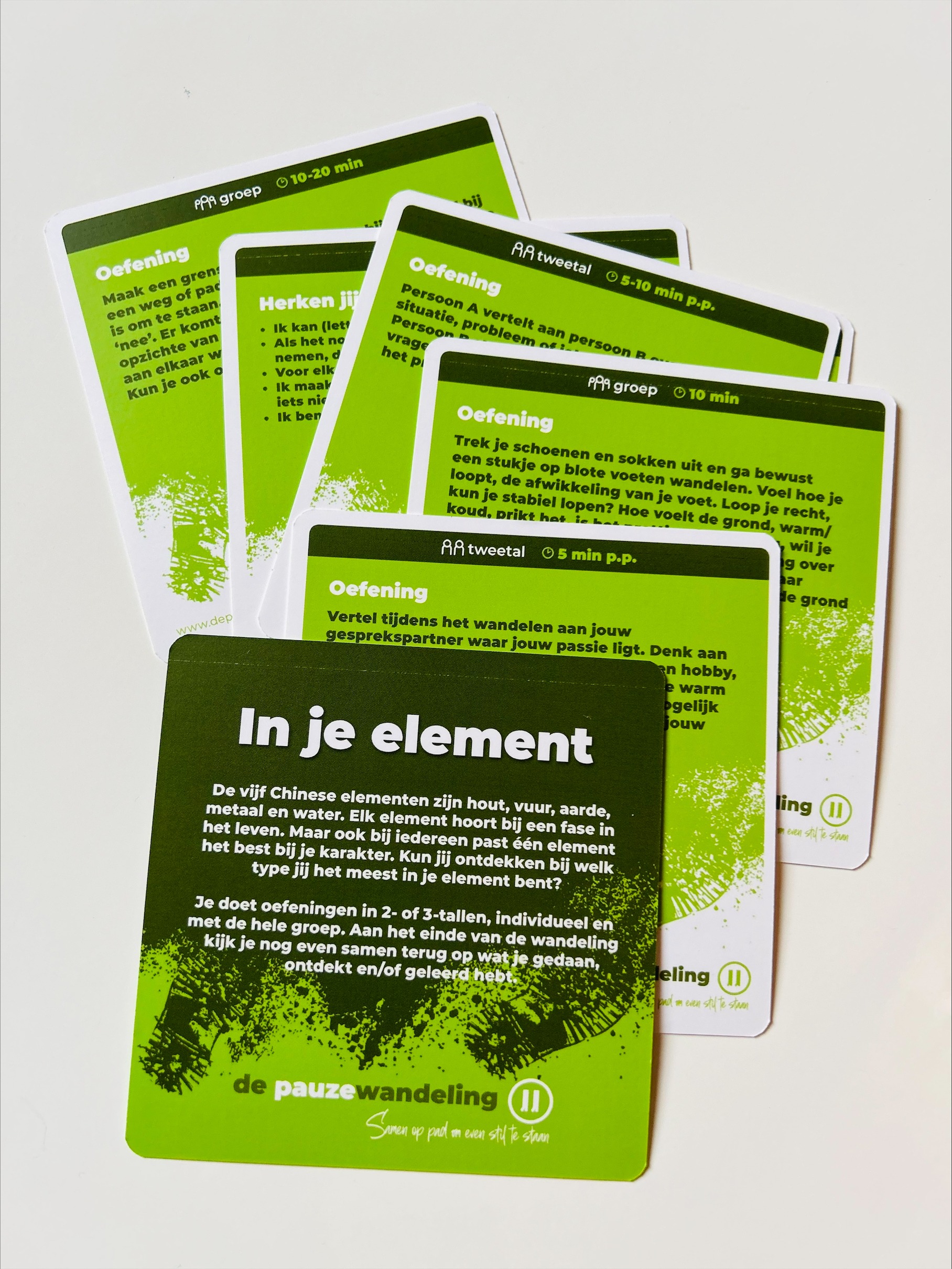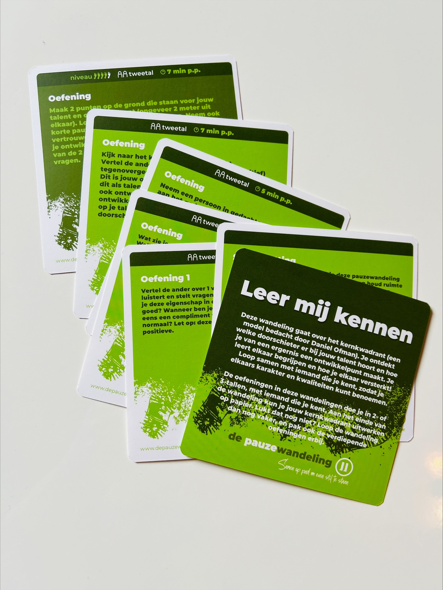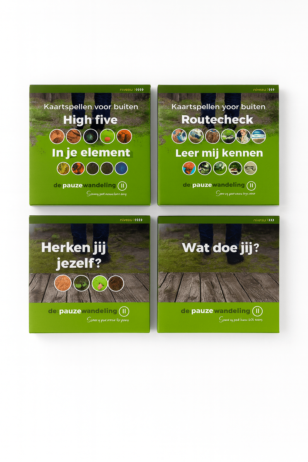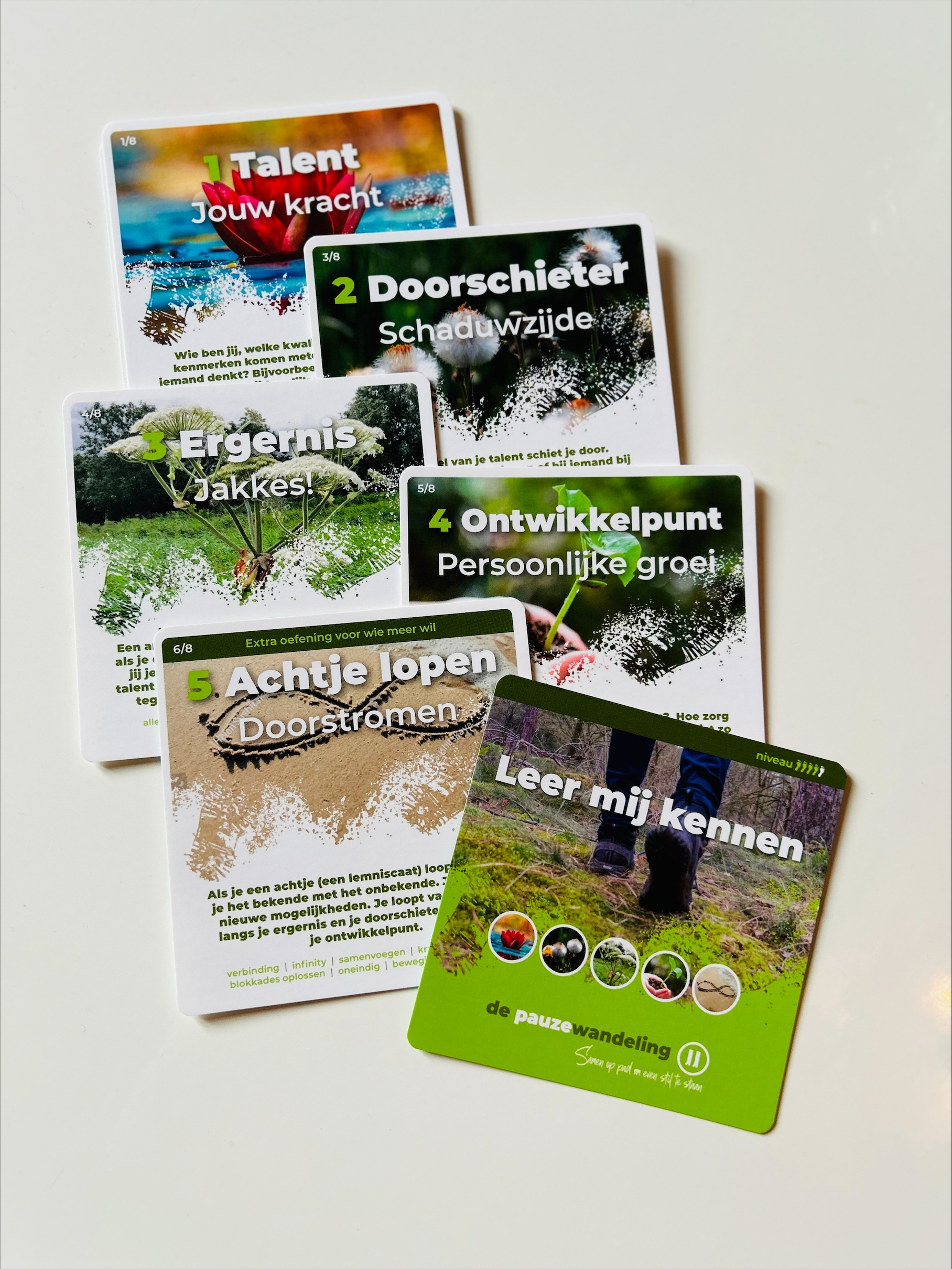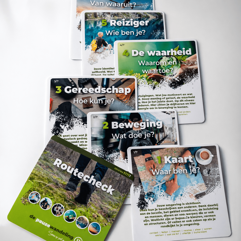 Door letterlijk in beweging te komen, ontstaat mentale ruimte. De natuur en het wandelen zorgen voor ontspanning, terwijl de vragen en oefeningen richting geven. Dit maakt de set geschikt voor zowel luchtige kennismaking als inhoudelijke ontwikkelthema’s.