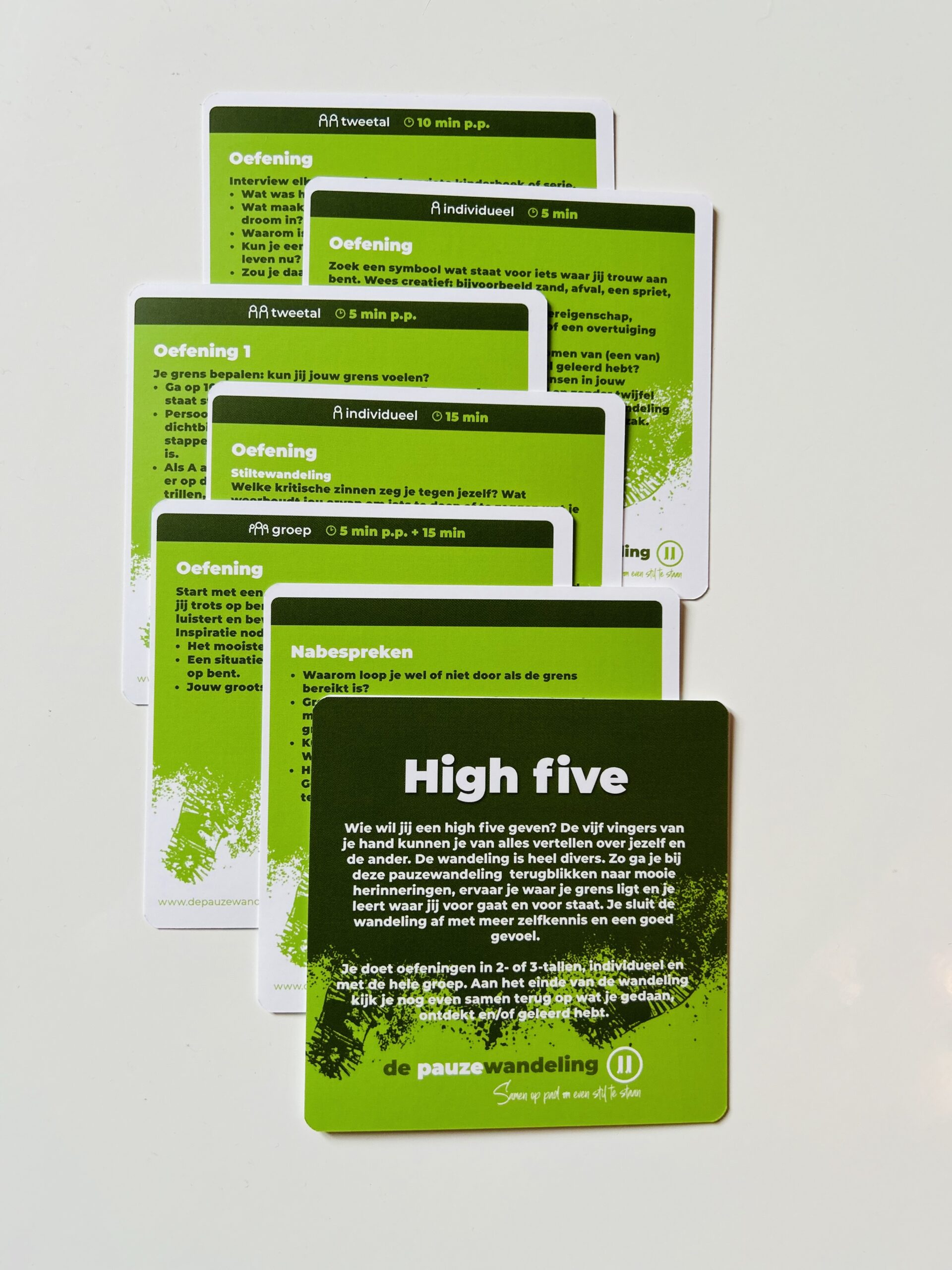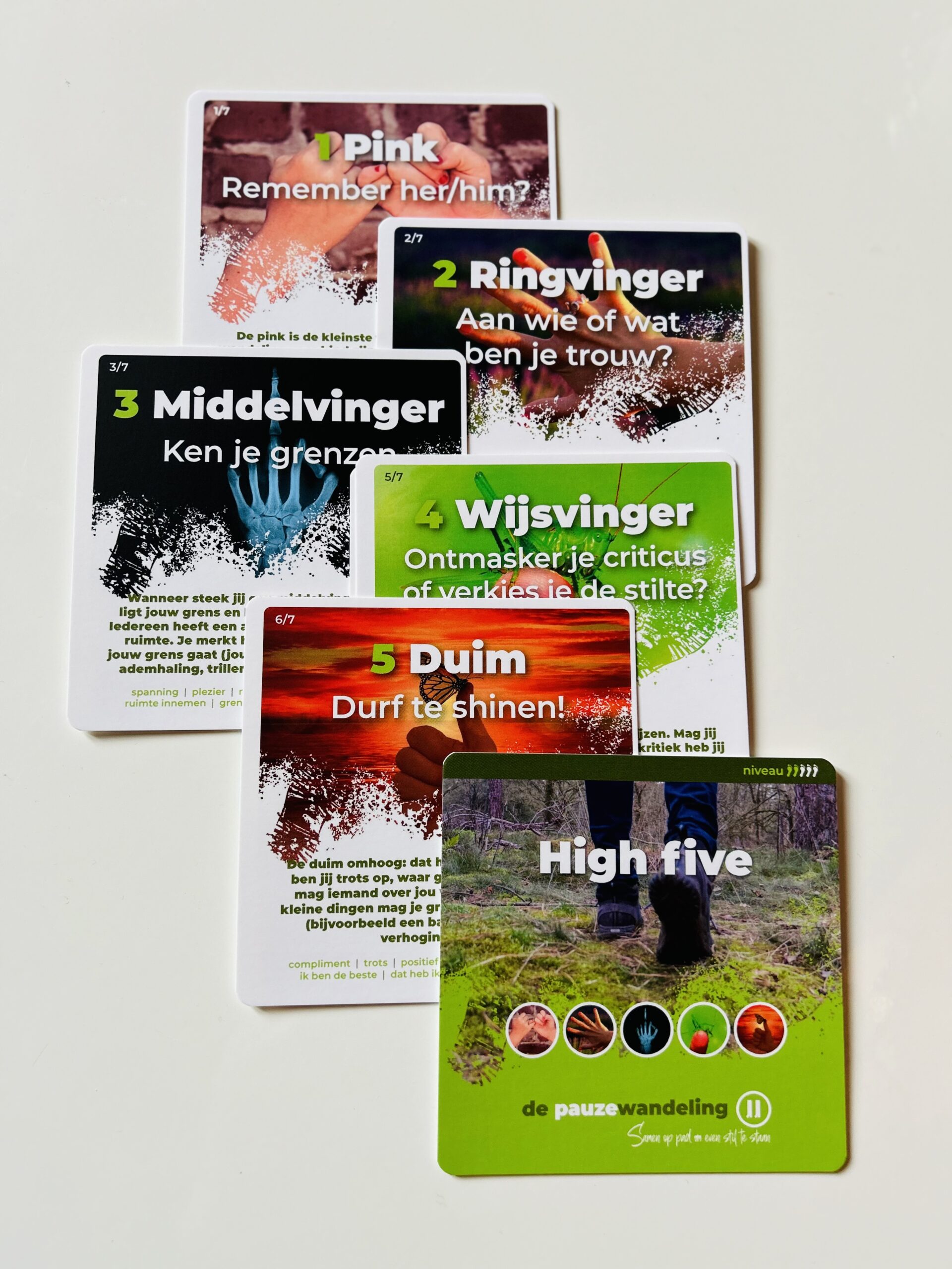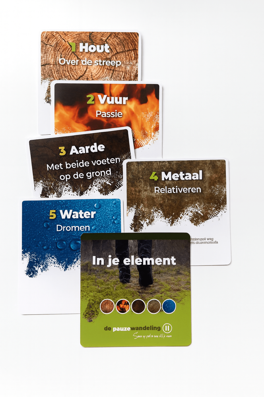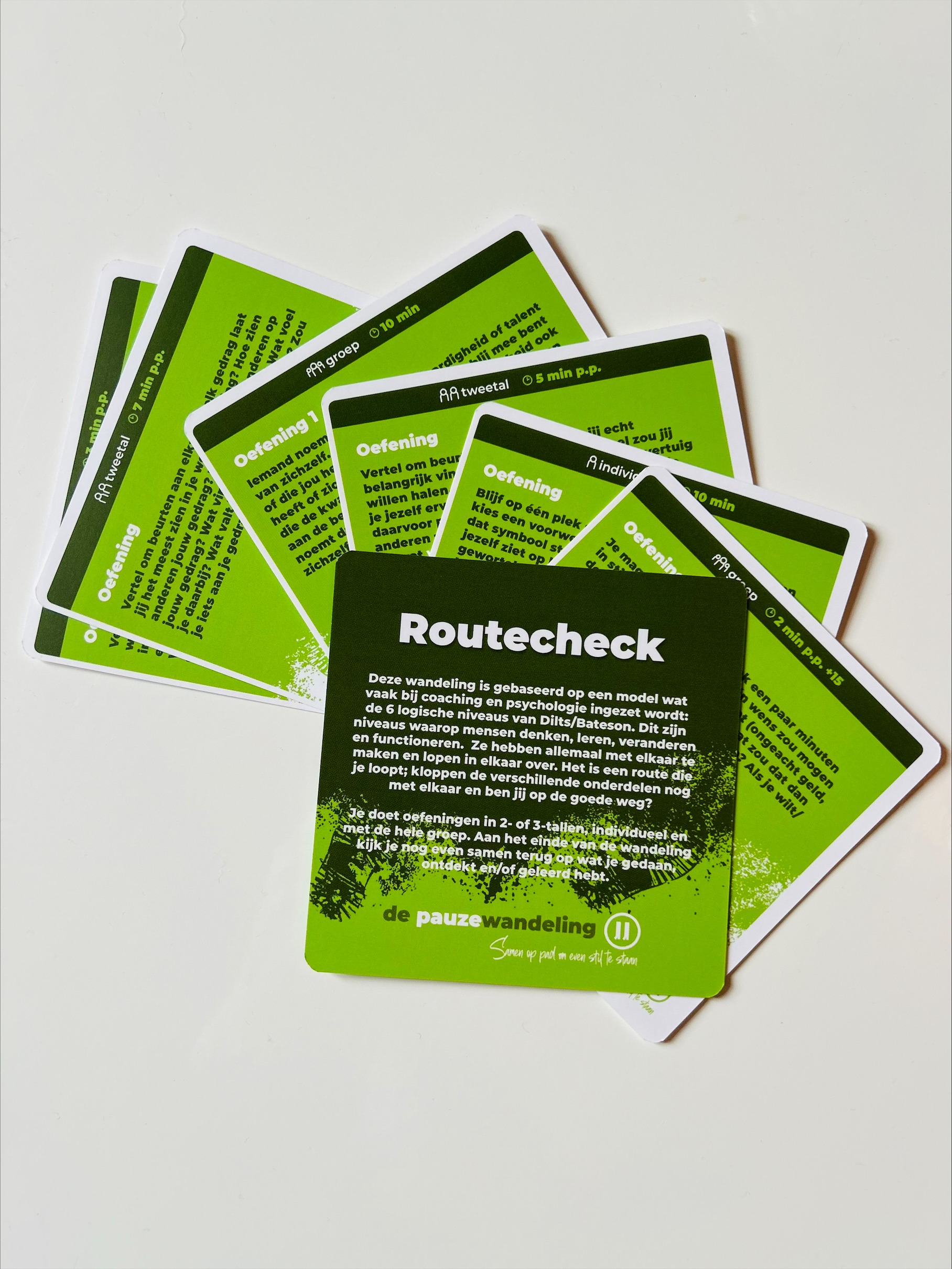 Door letterlijk in beweging te komen, ontstaat mentale ruimte. De natuur en het wandelen zorgen voor ontspanning, terwijl de vragen en oefeningen richting geven. Dit maakt de set geschikt voor zowel luchtige kennismaking als inhoudelijke ontwikkelthema’s.