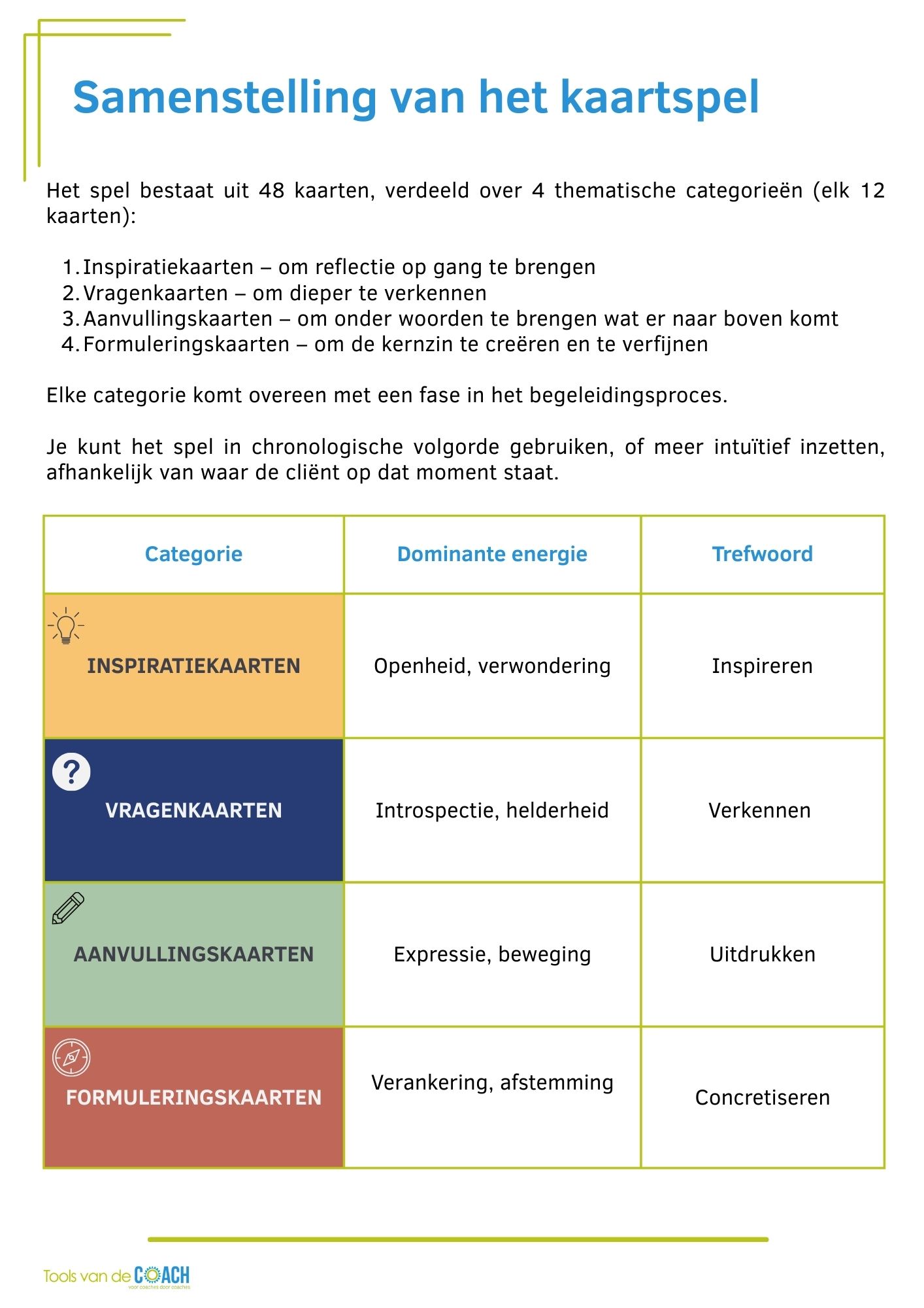• 4 kaartcategorieën: Inspiratie, Vragen, Aanvullen en Formuleren
