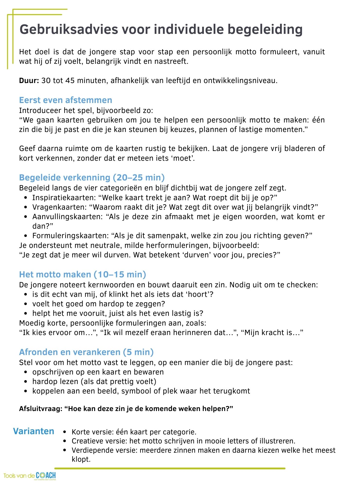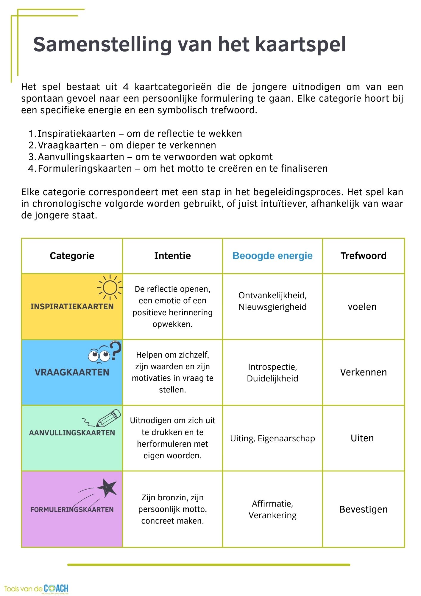 • Verloop: korte introductie, kaarttrekking per categorie, uitwisseling in duo’s, motto schrijven en (optioneel) delen